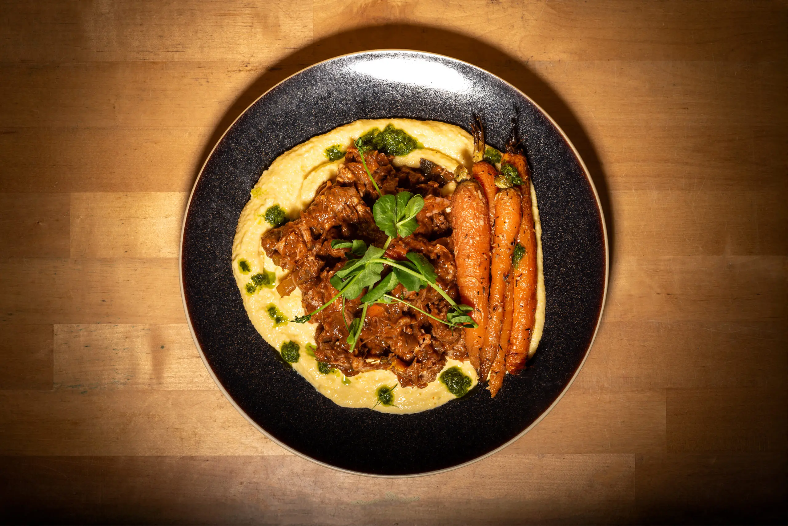 Italiaans stoofvlees van sukade met salie, polenta, een rijke Italiaanse jus, gremolata en geroosterde peen.