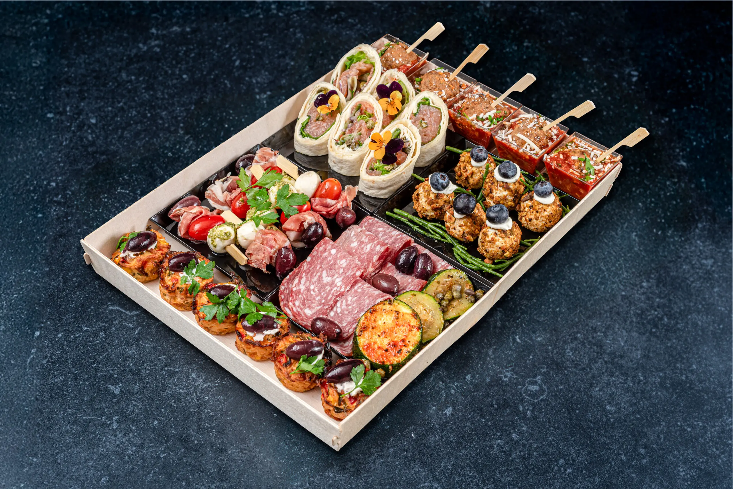 Per hapjesbox serveren wij 2 plateaus van ieder 30 hapjes