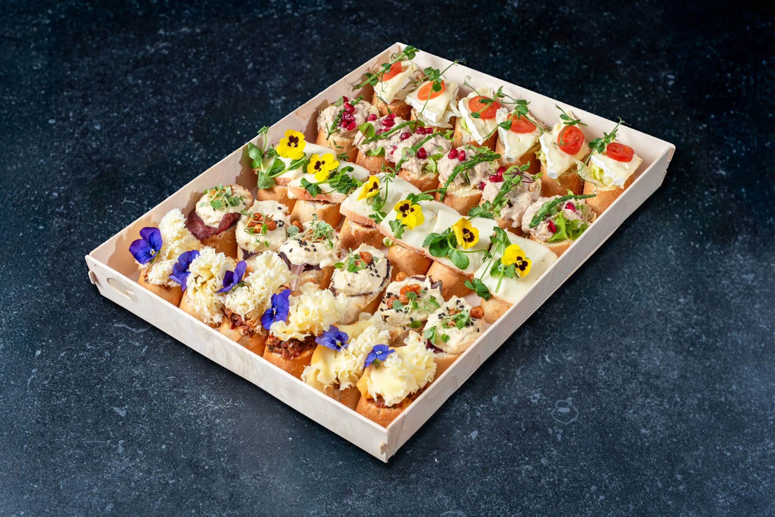 De luxe vega en vegan broodhapjes zijn beschikbaar in diverse samenstellingen met verschillende toppings. Wilt u een andere samenstelling? Laat het ons weten!